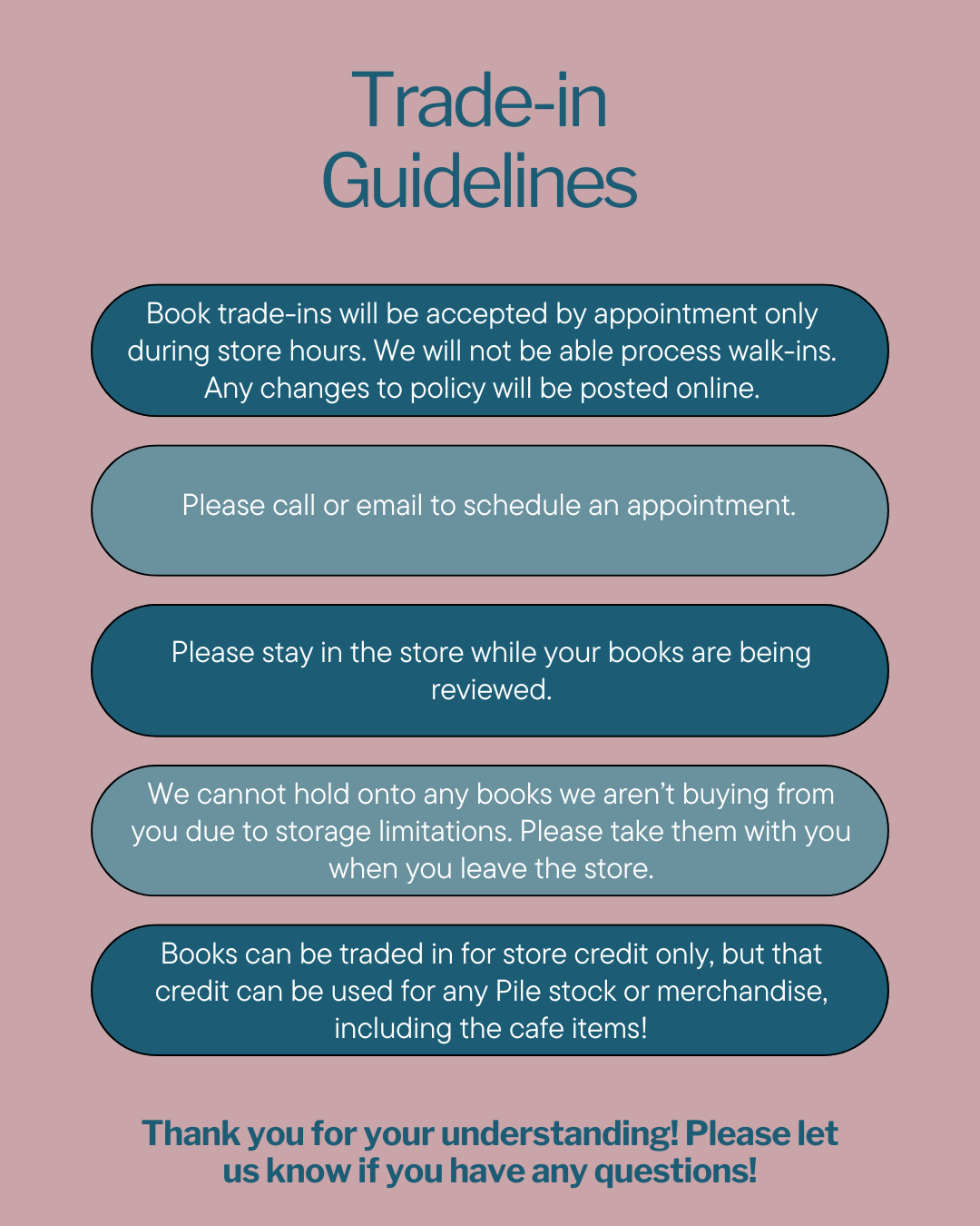 If these expectations cannot be met, a member may be asked to no longer participate. Each expectation not met will be addressed individually depending on the severity of the occurrence. If a member feels uncomfortable at any time during book club, please reach out to info@thepilebookstore.com with your concerns.